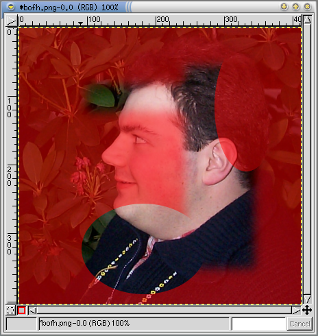 To avoid this mistakeable representation of a selection you can use the quickmask. Click on the red rectangle at the bottom left of the image window. Areas that are not selected get dyed red, depending on the strength of the selection a pixel is more visible in its original color. In this representation the selection can be modified with the regular paint tools. If you paint a white stroke on the red areas and switch back to the marching ants you can see, that the area of the stroke now is selected. You can use this method to match a selection to an object in an image.
